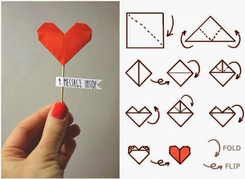 Necesitamos un cuadrado de papel, doblamos el papel por las dos diagonales. Y volvemos a doblar hasta conseguir un rombo. Cuando tengas el rombo lo giras y a continuación doblas todo lo necesario para conseguir el corazón |